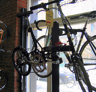 As the train arrived at my destination I put on every bit of cold weather gear I had and braced myself for the ride home. The Hyper-fold Tikit is nice because with no QRs to deal with you can fold/unfold your bike in full-on winter gloves. A definite plus in the Great White North - metal and exposed skin is not a great idea. Riding was a bit awkward in my bulky clothing - especially my huge insulated boots, but I was prepared to sacrifice elegance for comfort under these conditions.